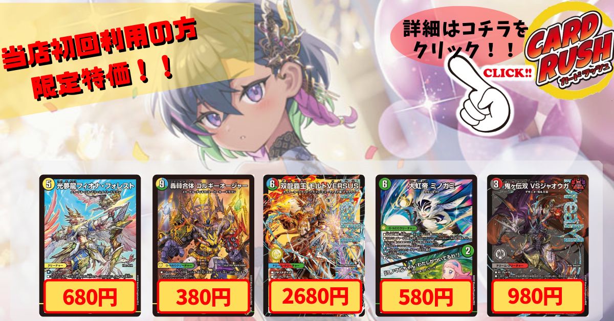 おすすめ商品 切札竜ボルメテウス・リバース・ドラゴン【DMR】{26RP1DM超秘1/DM1}《水》 [キリフダリュウボルメテウスリバースドラゴン] 998,000円(税込) 在庫数 1点 プレイマット『[GP2026-1st]ボルシャック・栄光・ルピア』【サプライ】{-} [プレイマット] 7,980円(税込) 在庫なし プレイマット『[GP2026-1st]偽りの希望鬼丸「終斗」』【サプライ】{-} [プレイマット] 1,180円(税込) 在庫数 5個 スリーブ『[GP2026-1st]ペテンズ・ゲート』60枚入り【サプライ】{-} [スリーブ] 4,980円(税込) 在庫数 3個 スリーブ『[GP2026-1st]ボルシャック・栄光・ルピア』60枚入り【サプライ】{-} [スリーブ] 7,980円(税込) 在庫数 1個 《No.213》100口限定1パック1000円オリパ(※ラストワン有)【No.213】{¥1,000} [《No.213》100口限定1パック1000円オリパ(※ラストワン有)【No.213】{¥1,000}] 1,000円(税込) 在庫なし 愛銀河マーズ・シンギュラリティ 魔誕の封殺ディアスZ 王導聖霊アルファディオス 世紀末の善悪 刀志猫のプワソン《当店初利用の方限定特価品》 [愛銀河マーズ・シンギュラリティ 魔誕の封殺ディアスZ 王導聖霊アルファディオス 世紀末の善悪 刀志猫のプワソン《当店初利用の方限定特価品》] 680円~2,980円(税込) 〔状態A-〕ボルシャック・ドラゴン(シリアル入り)【-】{}《火》 [[状態A-]ボルシャックドラゴンシリアル] 548,000円(税込) 在庫数 1個 〔状態A-〕無双竜機ボルバルザーク(シリアル入り)【-】{-}《多》 [[状態A-]ムソウリュウキボルバルザークシリアル] 748,000円(税込) 在庫数 1個 メンデルスゾーン【R】{25EX4SSP1/SSP1}《多》 [メンデルスゾーン] 218,000円(税込) 在庫数 1枚 王道の革命ドギラゴン【SR】{24BD1秘1/秘1}《多》 [オウドウノカクメイドギラゴン] 118,000円(税込) 在庫数 3枚 ロスト・Re:ソウル【R】{22RP2XSP6/SP5}《闇》 [ロストReソウル] 84,800円(税込) 在庫数 2枚 デアリレッドゾーン【ver1.2】{40枚}《デッキ販売》 [デッキ販売] 43,600円(税込) 在庫なし 赤白アーマード【ver1.0】{40枚}《デッキ販売》 [デッキ販売] 11,600円(税込) 在庫数 1点 ドロマー邪眼帝【ver1.0】{40枚}《デッキ販売》 [デッキ販売] 42,500円(税込) 在庫数 1点 4Cテレポート【ver1.0】{48枚}《デッキ販売》 [デッキ販売] 80,800円(税込) 在庫数 1点 ドラッヘループ【ver1.0】{40枚}《デッキ販売》 [デッキ販売] 18,600円(税込) 在庫数 1点 プレイマット『[デュエプレ]DUAL☆WORLD』【サプライ】{-} [プレイマット] 108,000円(税込) 在庫数 1個 プレイマット『[デュエプレ]闇の守護者ルカ』【サプライ】{-} [プレイマット] 94,800円(税込) 在庫数 1個 スリーブ『[デュエプレ]ヴィヴィ(EP29)』64枚入り【サプライ】{-} [スリーブ] 37,800円(税込) 在庫数 2個 スリーブ『[デュエプレ]かいしんの一撃☆』64枚入り【サプライ】{-} [スリーブ] 2,180円(税込) 在庫数 18個 〔状態A-〕DM-01 第1弾【-】{-}《未開封BOX》 [[状態A-]ミカイフウBOX] 118,000円(税込) 在庫数 1個 DM-04 第4弾「闇騎士団の逆襲」【-】{-}《未開封BOX》 [ミカイフウBOX] 548,000円(税込) 在庫数 1個 〔状態A-〕DMC-04「黒城暗黒強化拡張パック」【-】{-}《未開封BOX》 [[状態A-]ミカイフウBOX] 238,000円(税込) 在庫数 1個 偽りの希望鬼丸「終斗」【SR】{23EX3S7/S10}《火》 [コードミラクルオニマルピリオド] 5,480円(税込) 在庫なし 轟く邪道レッドゾーン【DMR】{25RP3DM1/DM1}《火》 [トドロクジャドウレッドゾーン] 4,280円(税込) 在庫なし 洗打の妖精【U】{25RP134/77}《水》 [スクラブフェアリー] 220円(税込) 在庫数 39枚 裏斬隠テンサイ・ハート【U】{25EX157/89}《水》 [ウラギリガクレテンサイハート] 580円(税込) 在庫数 57枚 巨魔天アオフェシー【R】{23RP414/74}《水》 [キョマテンアオフェシー] 1,180円(税込) 在庫なし ♪立ち上がる悪魔に天使堕ちるかな【VR】{26SD1C8/14}《水》 [タチアガルアクマニテンシオチルカナC] 480円(税込) 在庫数 94点 天革の騎令嬢ミラクルステラ【SR】{25EX16/89}《水》 [テンカクノキレイジョウミラクルステラ] 3,780円(税込) 在庫数 17枚 〜西方より来る激流の竜騎公〜【SR】{25RP1S2/S11}《水》 [ハイドロビスマルク] 980円(税込) 在庫数 20枚 トワイライトMk.1Typeホーガン/「イチバンになってみせる!」【SR】{25EX13/89}《水》 [トワイライトMk1Typeホーガンイチバンニナッテミセル] 680円(税込) 在庫なし 飛翔龍5000VT【VIC】{25RP3TR1/TR9}《水》 [フライングブイ5000VT] 2,980円(税込) 在庫数 2枚 ジャスミンの地版【C】{23EX183/84}《自然》 [ジャスミンノルーン] 280円(税込) 在庫数 11枚 轟速奪取トップギジャ【C】{25RP375/77}《自然》 [ソニックダッシュトップギジャ] 80円(税込) 在庫数 15枚 葉鳴妖精ハキリ【VR】{ART141/6}《自然》 [ハンナリヨウセイハキリ] 4,980円(税込) 在庫数 14枚 料理犬のヴィヤンドゥ【VR】{24EX122/89}《自然》 [リョウリケンノヴィヤンドゥ] 480円(税込) 在庫数 48枚 PP-「P」【VR】{25RP36/77}《自然》 [PPP] 2,780円(税込) 在庫数 62枚 トラップの地版【C】{RP2174/76}《自然》 [トラップノルーン] 220円(税込) 在庫数 71枚 レヴィヤの地版【R】{RP2225/76}《自然》 [レヴィヤノルーン] 980円(税込) 在庫数 14枚 BARUGA-雷座87【R】{25RP221/77}《自然》 [BARUGAライザー87] 580円(税込) 在庫