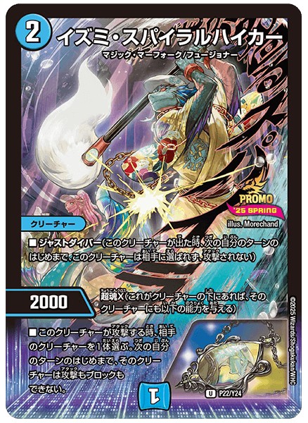 ジャストダイバー(このクリーチャーが出た時、次の自分のターンのはじめまで、このクリーチャーは相手に選ばれず、攻撃されない)超魂X(これがクリーチャーの下にあれば、そのクリーチャーにも以下の能力を与える)このクリーチャーが攻撃する時、相手のクリーチャーを1体選ぶ。次の自分のターンのはじめまで、そのクリーチャーは攻撃もブロックもできない。